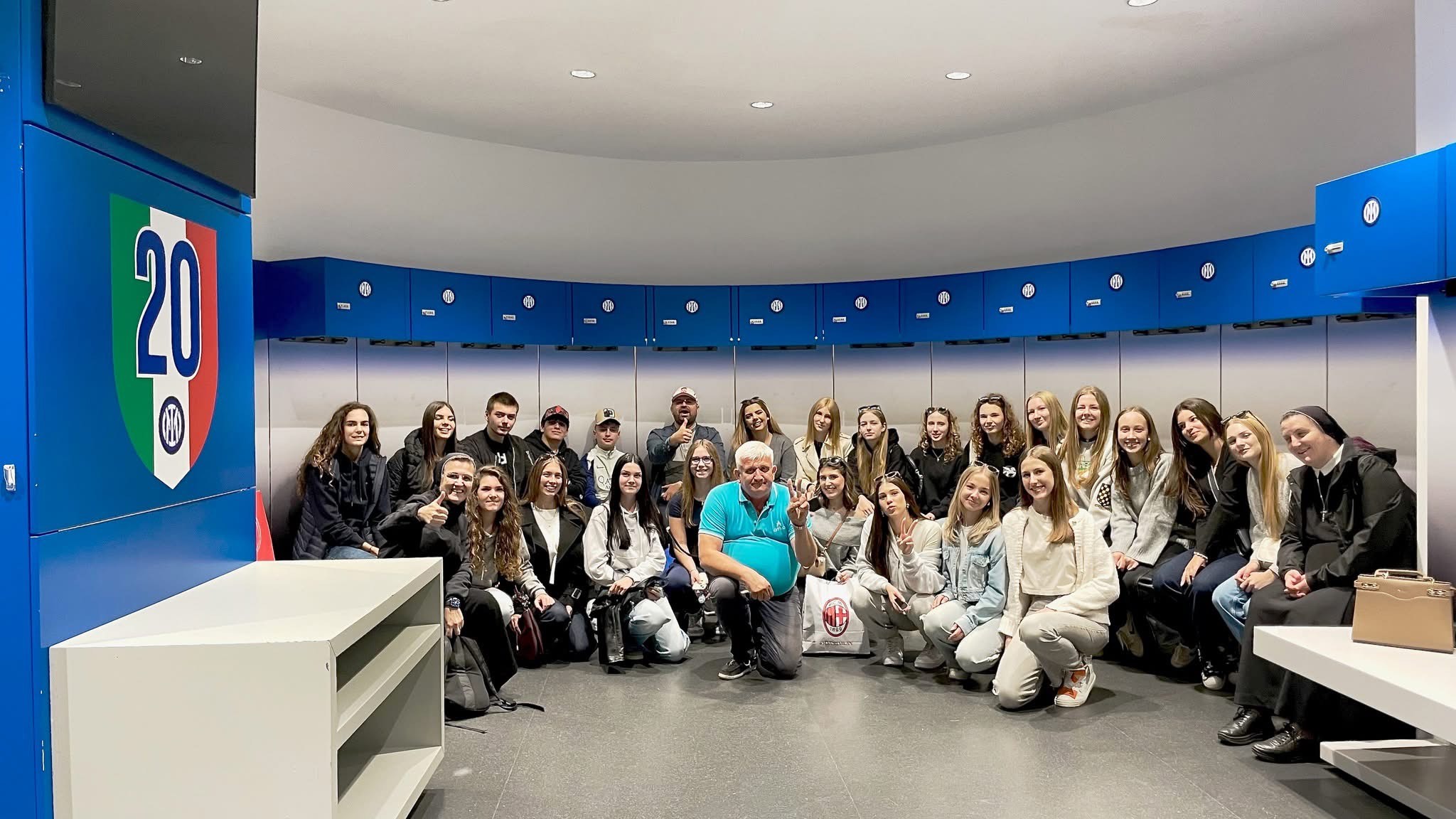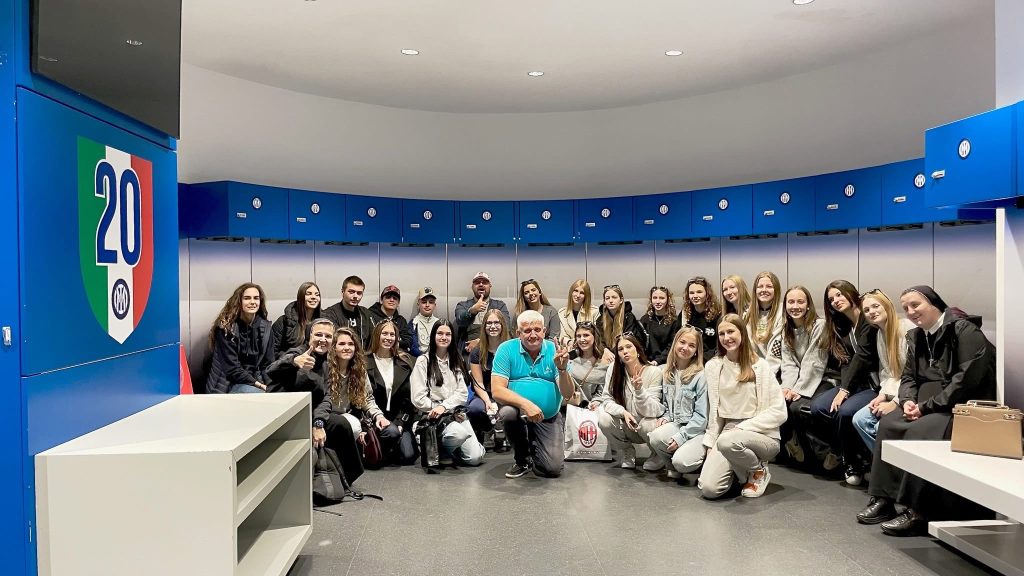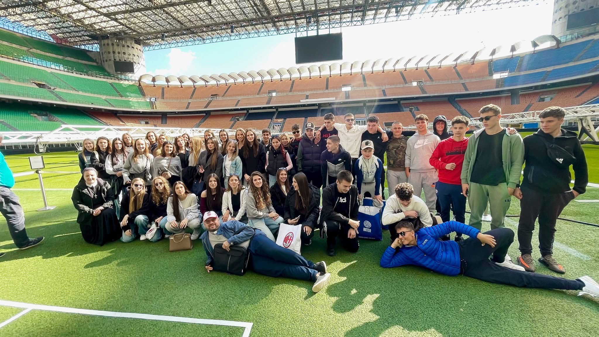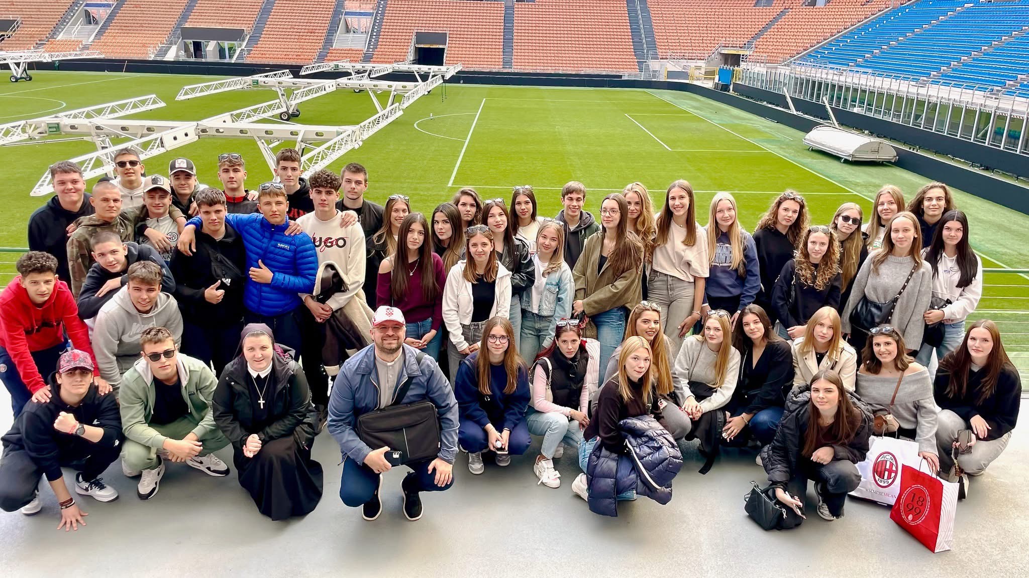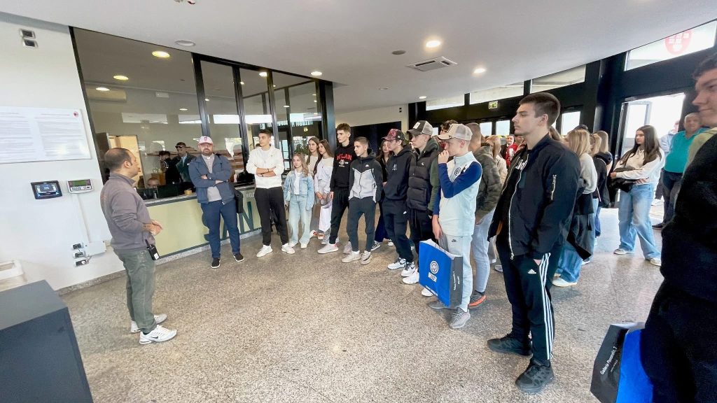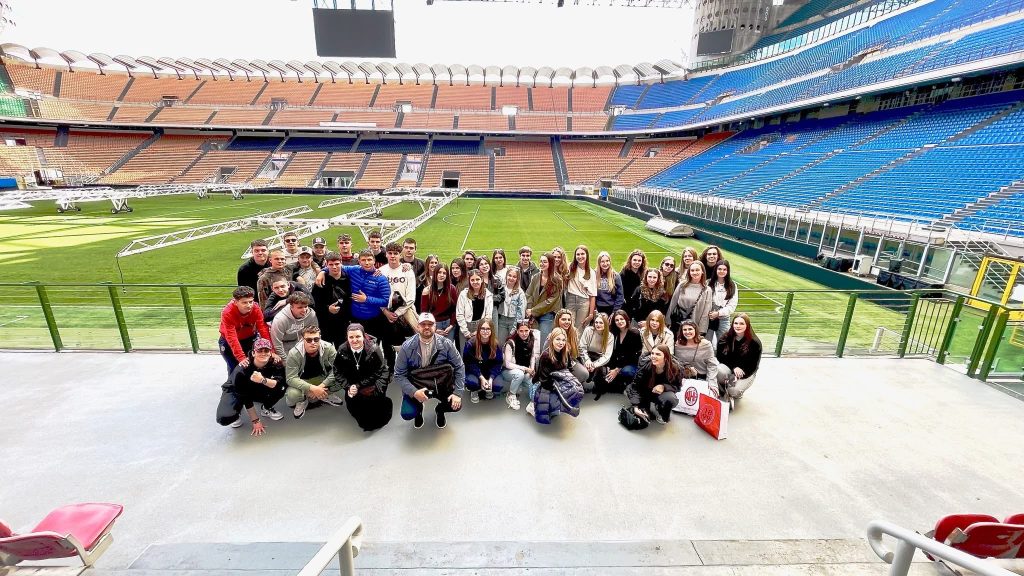Još u jutarnjim satima uslijedio je posjet legendarnom Stadio Giuseppe Meazza na San Siru, simbolu talijanskog sporta i strasti. Učenici su obišli muzej nogometnih legendi, svlačionice, tunel i tribine te kroz objektiv kamere istražili povezanost sporta i umjetnosti. U suradnji s udrugom Circonvalla Film i redateljem Fabio Martina Fabiom Martinom, dogovoren je zajednički međunarodni projekt “Young San Siro”, koji povezuje mlade kroz film, kreativnost i sportski duh. Mladi su kroz mobitele u suradnji sa San Siro stadionom napravili zajednički video.
